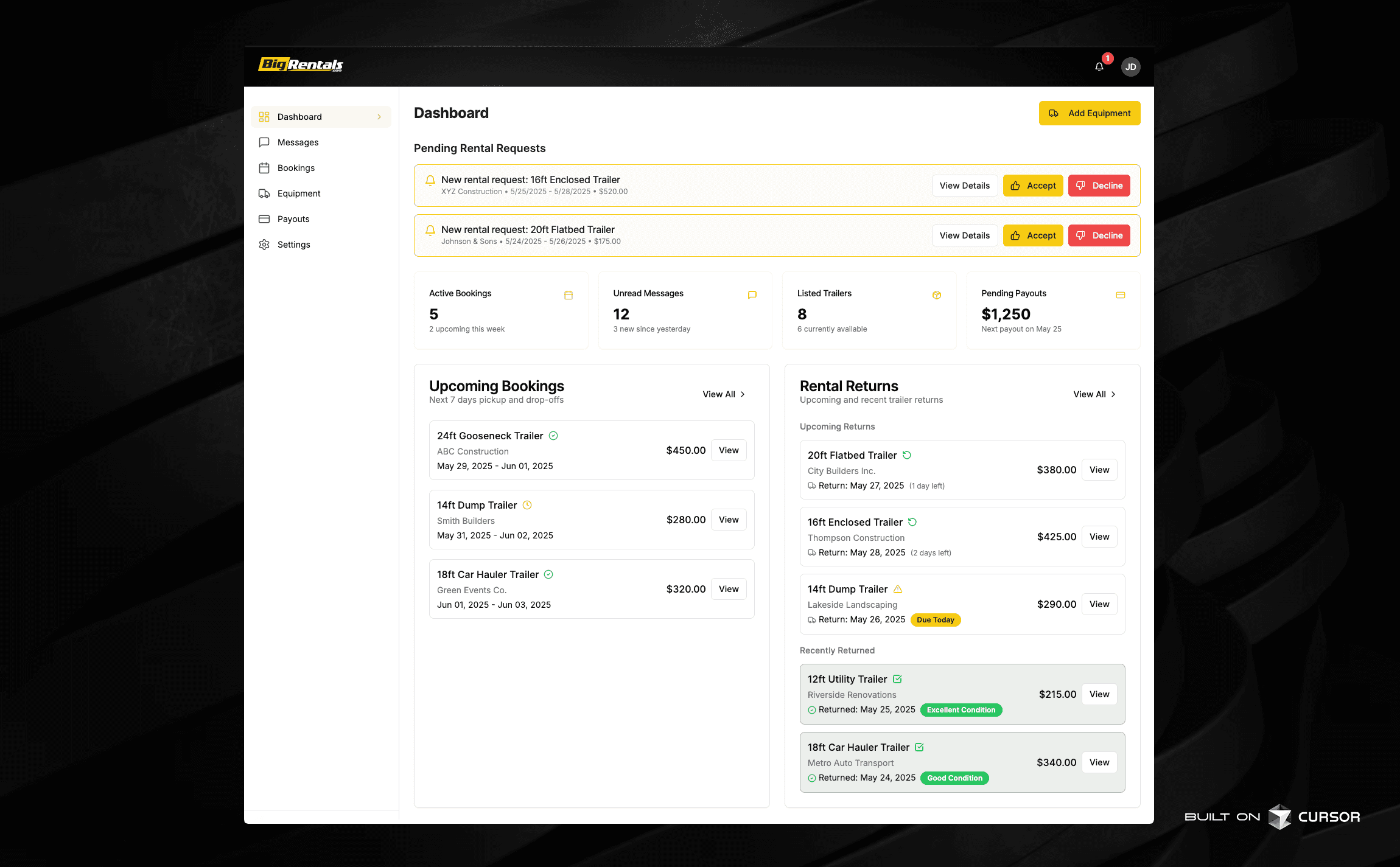 At BigRentals, I’ve been building the supplier-facing platform from the ground up—starting with strategy and research and continuing through UX design and hands-on product development. The goal: to give small equipment suppliers a powerful, modern tool to manage and grow their rental operations more efficiently.